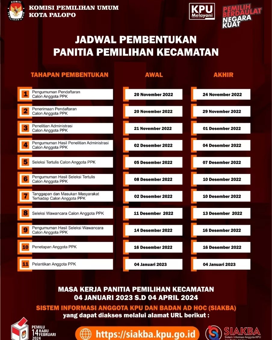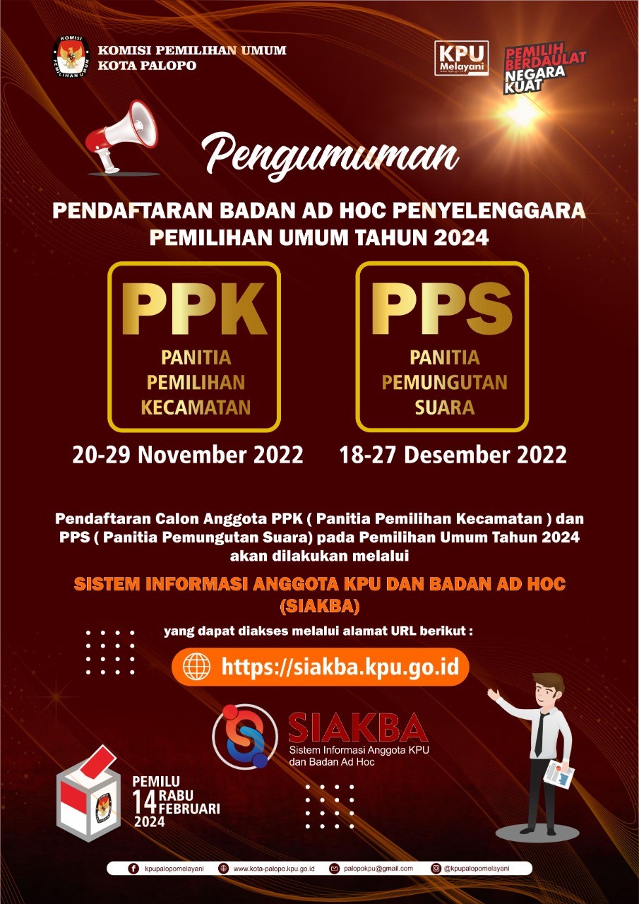PALOPO -- Komisi Pemilihan Umum (KPU) Kota Palopo resmi membuka pendaftaran calon anggota Panitia Pemilihan Kecamatan (PPK) mulai 20 November 2022. Ketua Divisi Sosialisasi, Pendidikan Pemilih, Partisipasi Masyarakat dan SDM KPU Kota Palopo, Surahman menjelaskan jika pendaftaran penerimaan berkas calon anggota PPK akan berlangsung hingga hari Selasa 29 November 2022.. "Ada sedikit perubahan dalam tata cara pendaftaran calon anggota PPK kali ini. Dimana KPU menggunakan sistem pendaftaran online menggunakan aplikasi SIAKBA", terang Surahman. Surahman menambahkan bagi calon pelamar dapat mengakses aplikasi SIAKBA melalui link https://siakba.kpu.go.id. "Selanjutnya nanti calon pendaftar akan diarahkan dalam pe gisian aplikasi SIAKBA", tambahnya. Guna mengantisipasi calon pendaftar dalam menjalankan aplikasi SIAKBA, KPU Kota Palopo membuka layanan helpdesk sebagai sarana bagi calon pelamar untuk mendapatkan informasi seputar pendaftarkan, persyaratan pendaftaran, dan cara menggunakan aplikasi SIAKBA. "Bagi calon pendaftar sebelum mendaftar sebaiknya mencari informasi yang jelas. Makanya kami siapkan helpdesk. Jadi silahkan datang ke helpdesk yang ada di kantor KPU Kota Palopo", jelasnya. Berikut persyaratan calon anggota PPK : a. Warga Negara Indonesia; b. Berusia paling rendah 17 (tujuh belas) tahun; c. Setia kepada Pancasila sebagai dasar Negara, Undang-Undang Dasar Negara Republik Indonesia Tahun 1945, Negara Kesatuan Republik Indonesia, Bhinneka Tunggal Ika dan cita-cita Proklamasi 17 Agustus 1945; d. Mempunyai integritas, pribadi yang kuat, jujur dan adil; e. Tidak menjadi anggota partai politik yang dinyatakan dengan surat pernyataan yang sah atau sekurang-kurangnya dalam waktu 5 (lima) tahun tidak lagi menjadi anggota partai politik yang dibuktikan dengan surat keterangan dari pengurus partai politik yang bersangkutan; f. Berdomisili dalam wilayah kerja PPK; g. Mampu secara jasmani, rohani dan bebas dari penyalahgunaan narkotika; h. Berpendidikan paling rendah sekolah menengah atas atau sederajat; dan i. Tidak pernah dipidana penjara berdasarkan putusan pengadilan yang telah memperoleh kekuatan hukum tetap karena melakukan tindak pidana yang diancam dengan pidana penjara 5 (lima) tahun atau lebih. Sementara untuk kelengkapan berkas calon pendaftar menyiapkan : 1. Surat pendaftaran 2. Daftar riwayat hidup 3. Foto copy KTP elekteonik 4. Foto copy ijazah menengah atas / sederajat atau ijazah terakhir 5. Pas foto 6. Surat pernyataan dan 7. Surat keterangan Sekali lagi surahman mengingatkan agar para calon pendaftar untuk memanfaatkan helpdesk yang ada di kantor KPU Kota Palopo untuk mendapatkan informasi yang jelas dan pasti.(isw)