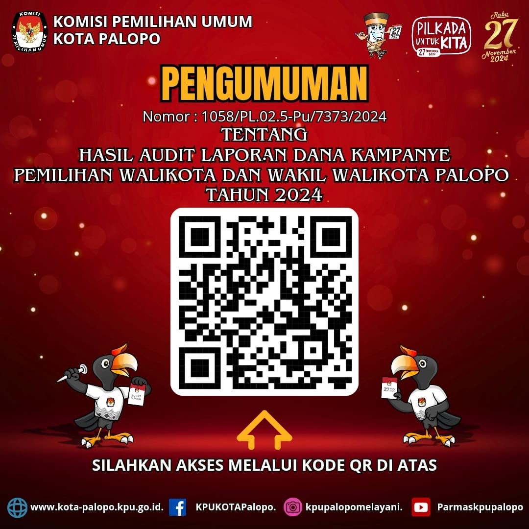 PENGUMUMAN NOMOR : 1235 /PP.04.2-PU/73/2025 TENTANG PENETAPAN HASIL PENILAIAN EVALUASI KINERJA PANITIA PEMILIHAN KECAMATAN DAN PANITIA PEMUNGUTAN SUARA DALAM PEMILIHAN WALIKOTA DAN WAKIL WALIKOTA PALOPO TAHUN 2024, PASCA PUTUSAN MAHKAMAH KONSTITUSI TERKAIT PERSELISIHAN HASIL PEMILIHAN WALIKOTA DAN WAKIL WALIKOTA PALOPO TAHUN 2024. Dalam rangka Hasil Penilaian Evaluasi Kinerja Panitia Pemilihan Kecamatan dan Panitia Pemungutan Suara pada Pemilihan Walikota dan Wakil Walikota Palopo Tahun 2024 Untuk Pengangkatan Kembali Sebagai Panitia Pemilihan Kecamatan dan Panitia Pemungutan Suara pada Pemilihan Walikota Dan Wakil Walikota Palopo Ulang Tahun 2025, Komisi Pemilihan Umum Provinsi Sulawesi Selatan melakukan Pembentukan PPK dan PPS dengan ketentuan sebagai berikut: Pelaksanaan penilaian evaluasi kinerja dilakukan berdasarkan Keputusan Komisi Pemilihan Umum Nomor 475 Tahun 2024 tentang Perubahan Kelima atas Keputusan Komisi Pemilihan Umum Nomor 476 Tahun 2022 tentang Pedoman Teknis Pembentukan Badan Adhoc Penyelenggara Pemilihan Umum dan Pemilihan Gubernur dan Wakil Gubernur, Bupati dan Wakil Bupati, dan Walikota dan Wakil Walikota tahun 2024; KPU Provinsi Sulawesi Selatan melakukan evaluasi kinerja bagi PPK dan PPS pada Pemilihan Walikota dan Wakil Walikota Palopo Tahun 2024 sejak tanggal 11 Maret 2025 sampai dengan 18 Maret 2025 yang melibatkan seluruh anggota PPK dan PPS, serta Perwakilan dari seluruh Sekretariat PPK dan PPS di lingkungan KPU Kota Kota Palopo. Penilaian Evaluasi Kinerja PPK dan PPS pada Pemilihan Walikota dan Wakil Walikota Palopo Tahun 2024 dilakukan terhadap: Anggota PPK sejumlah : 45 orang; dan Anggota PPS sejumlah : 144 orang. Hasil Penilaian Evaluasi Kinerja PPK dan PPS pada pada Pemilihan Walikota dan Wakil Walikota Palopo Tahun 2024 adalah sebagai berikut: PPK Direkomendasikan : 34 orang untuk direkomendasikan diangkat kembali menjadi PPK untuk Pemilihan Tahun 2024; Tidak Direkomendasikan : 11 orang tidak direkomendasikan diangkat kembali menjadi PPK untuk Pemilihan Tahun 2024; PPS Direkomendasikan : 119 orang untuk direkomendasikan diangkat kembali menjadi PPS untuk Pemilihan Tahun 2024; Tidak Direkomendasikan : 25 orang tidak direkomendasikan diangkat kembali menjadi PPS untuk Pemilihan Tahun 2024; Adapun rincian dari penilaian adalah sebagaimana terlampir dalam Lampiran Berita Acara ini. Bagi Anggota PPK dan PPS pada Pemilihan pada Pemilihan Walikota dan Wakil Walikota Palopo Tahun 2024 yang memenuhi kelayakan dengan status direkomendasikan akan dilakukan konfirmasi kesediaan sebagai Anggota PPK dan PPS pada Pemilihan Walikota dan Wakil Walikota Palopo Ulang Tahun 2024. Apabila dalam pelaksanaan terdapat kekurangan terhadap kebutuhan jumlah PPK dan PPS pada Pemilihan Walikota dan Wakil Walikota Palopo Ulang Tahun 2024, maka KPU Provinsi Sulawesi Selatan akan melakukan Pemenuhan jumlah kebutuhan dengan melakukan konfirmasi kesediaan yang memprioritaskan dari: Calon pengganti antarwaktu PPK dan PPS hasil seleksi terbuka pada Pemilihan Tahun 2024 yang masih memenuhi persyaratan dan bersedia; Calon PPK dan PPS yang lulus seleksi tertulis hasil seleksi terbuka pada Pemilihan Tahun 2024 yang masih memenuhi persyaratan dan bersedia; Calon PPK dan PPS yang lulus administrasi hasil seleksi terbuka pada Pemilihan Tahun 2024 yang masih memenuhi persyaratan dan bersedia; Penunjukan calon PPK dan PPS di luar pendaftar pada Pemilihan Tahun 2024 yang memenuhi persyaratan. KPU Provinsi Sulawesi Selatan melakukan Pengumuman Hasil Evaluasi Kinerja PPK dan PPK pada Pemilihan pada Pemilihan Walikota Dan Wakil Walikota Palopo Tahun 2024 tanggal 20 Maret 2025 dan akan menerima tanggapan dan masukan masyarakat sejak tanggal 20 s/d 30 Maret 2025. Helpdesk KPU Kota Palopo dalam Pembentukan PPK dan PPS untuk Penyelenggaraan Pemilihan Walikota Dan Wakil Walikota Palopo Ulang Tahun 2024. Alamat : Jl. Pemuda Kelurahan Takkalala Kec. Wara Selatan Kota Palopo Kontak : 1. Mutia Adam ( 0822 8399 0116 ) 2. Jihan Al Djawaz ( 0853 9770 0099 ) 3. Muh. Rivai Noya ( 0812 8866 447 ) KLIK TAUTAN DI BAWA INI PENETAPAN HASIL PENILAIAN EVALUASI KINERJA PANITIA PEMILIHAN KECAMATAN DAN PANITIA PEMUNGUTAN SUARA