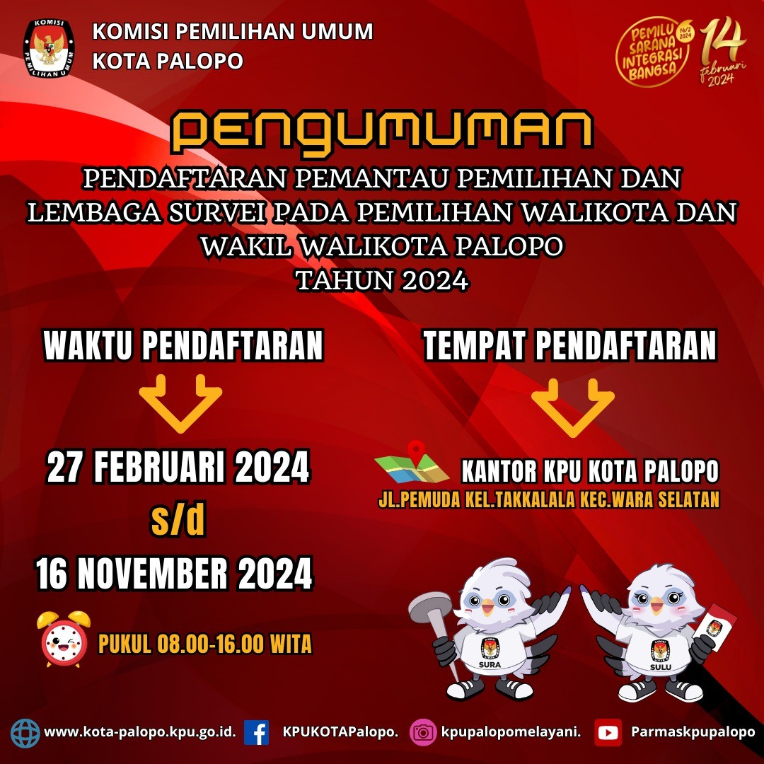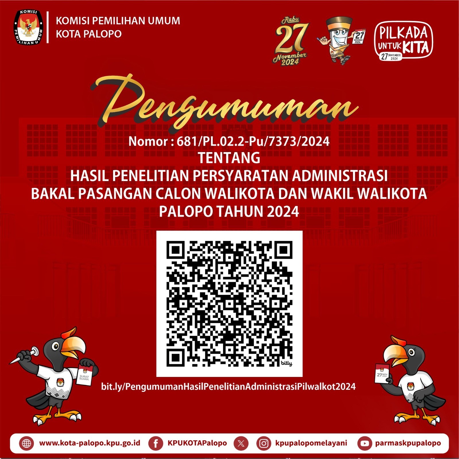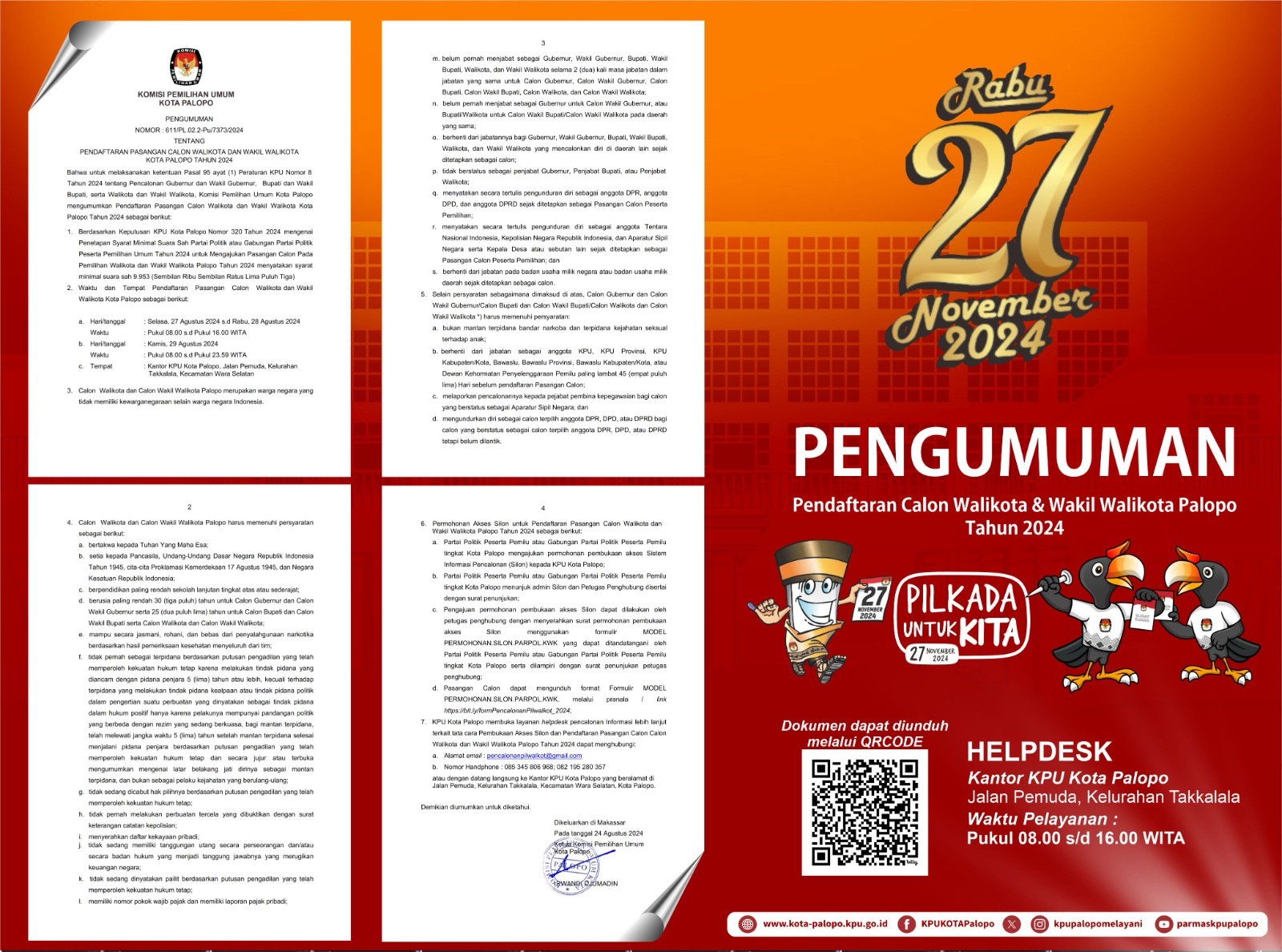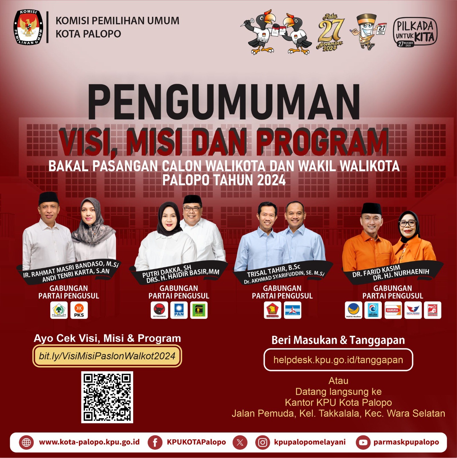 PALOPO - Komisi Pemilihan Umum Kota Palopo mengumumkan Visi, Misi dan Program Kerja bakal Pasangan Calon Walikota dan Wakil Walikota Palopo pada Pilkada serentak tahun 2024. Hal tersebut berdasarkan surat Pengumuman Komisi Pemilihan Umum Palopo dengan NOMOR : 682/PL.02.2-PU/7373/2024. Pengumumngan itu berdasarkan Peraturan KPU Nomor 8 Tahun 2024 tentang Pencalonan Gubernur dan Wakil Gubernur, Bupati dan Wakil Bupati, serta Walikota dan Wakil Walikota sebagaimana telah diubah dengan Peraturan KPU Nomor 10 Tahun 2024 tentang Perubahan Atas Peraturan KPU Nomor 8 Tahun 2024 tentang Pencalonan Gubernur dan Wakil Gubernur, Bupati dan Wakil Bupati, serta Walikota dan Wakil Walikota. Berikut Pengumuman tentang publikasi Visi, Misi dan Program Kerja Bakal Pasangan Calon Walikota Palopo Tahun 2024. Visi, Misi dan Program Kerja Bakal Pasangan Calon Walikota Palopo Tahun 2024. Klik link di bawa ini IR. Rahmat Masri Bandaso,M.Si & Andi Tenri Karta. S.AN Putriana Hamda Dakka, SH & DRS. H. Haidir Basir, MM Trisal Tahir, B.Sc & Dr. Akhmad Syarifuddin Daud. SE. M.Si Dr. H. Farid Kasim, SH., M.Si., MH & Dr. Hj. Nurhaenih, S.Kp., M.Kes